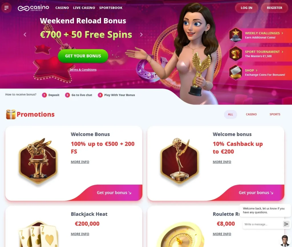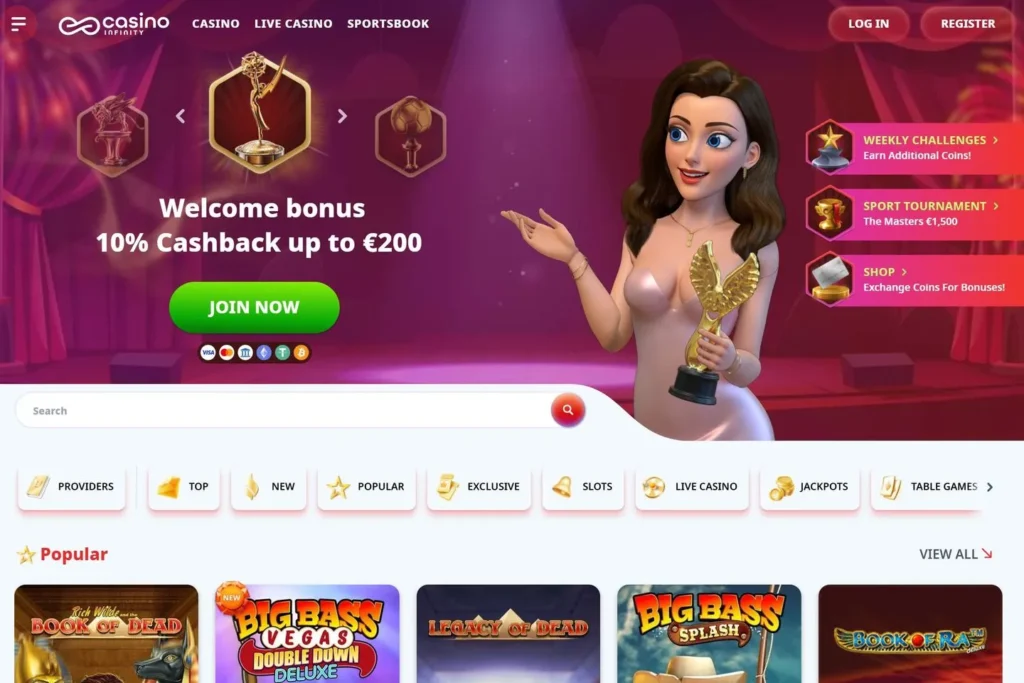 Casino Infinity je inovativni virtualni casino koji nudi usluge online casina i sportskog klađenja na jednoj adresi. Infinity je popularno odredište za zabavu za igrače iz cijelog svijeta. Casino podržava mnoge načine plaćanja i valute te je dostupan na 9 jezika, uključujući češki, mađarski i poljski. Casino se zove Infinity iz očiglednog razloga – nudi beskrajnu zabavu. Dostupne su igre od preko 100 proizvođača. Ukupno ih ima preko 7000. Možete dobiti 100% bonusa prilikom registracije i ostale tjedne bonuse.