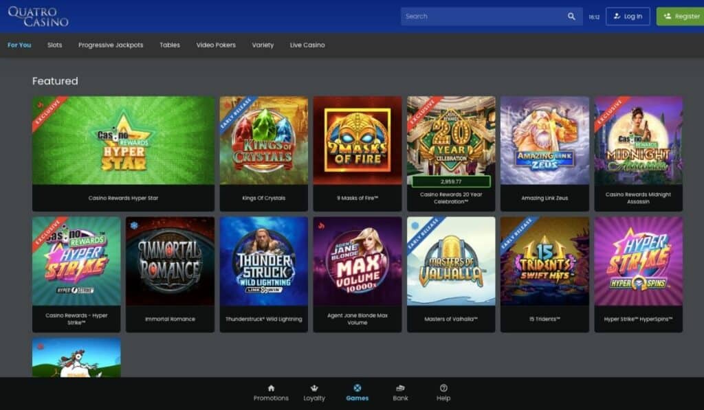 Quatro je još jedan pouzdani online casino iz Casino Rewards mreže. Od 2008. godine nudi online igračima najbolje iskustvo igranja. Trenutno je dostupno preko 550 igara. Kao član Casino Rewards mreže, svojim igračima nudi najbolji program vjernosti u casinu. Quatro casino je popularan i kod novih i kod iskusnih igrača. Cijeli portfelj igara uključuje popularne slotove, najnovije igre i klasične casino igre koje možete igrati i uživo. Quatro casino je definitivno jedan od najizdašnijih casina na internetu. Možete dobiti do 700 besplatnih okretaja i bonus do 100 € na svoj prvi depozit .